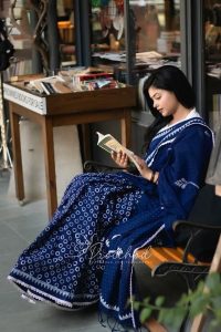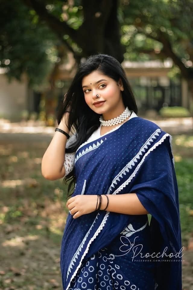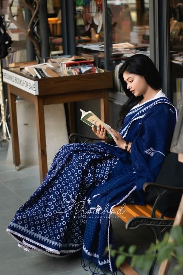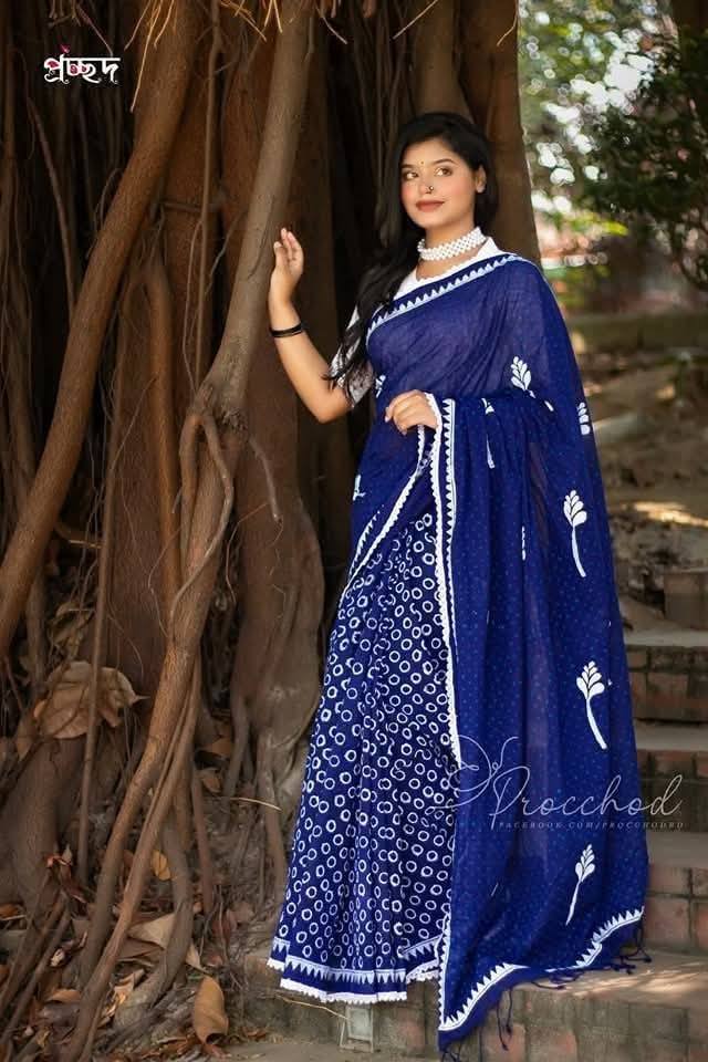 হ্যান্ডলুম কটন ১৪- হাত সফট শাড়ি হাতব্লকের ছাপে ফুটে উঠেছে।পুরো শাড়ীতে লেইস লাগানো হয়েছে ।আচলে ট্যাসেল আছে।